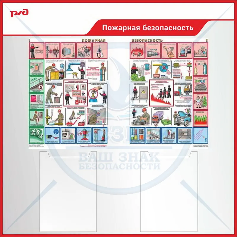 Стенд. Стенд Уголок по охране труда ( 4 кармана формата А4, плоских, 2 кармана формата А4, объемных) стиль РЖД с логотипом, Логотип (1000х1000; Пластик ПВХ 4 мм, алюминиевый профиль; )